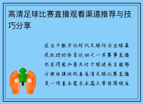 在当今数字化时代,足球作为全球最受欢迎的体育运动之一,其赛事直播也变得愈加普及。对于球迷而言,能够方便快捷地观看高清足球比赛直播,是一项基本需求。本篇文章将围绕“高清足球比赛直播观看渠道推荐与技巧分享”这一主题,从多个角度进行详细探讨。首先,我们将介绍几种主流的观看渠道,包括传统电视、网络直播平台及...